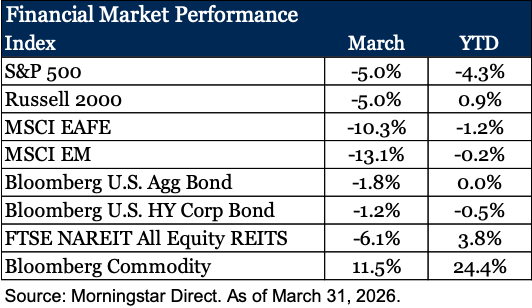 - In March, markets gave up much of the gains they had generated for the quarter as the Iranian conflict persisted. Stocks sold off on sentiment, and rates rose based on inflation concerns.