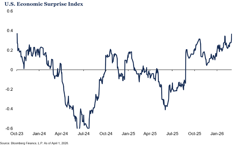 On balance, we see genuine reasons for measured optimism. Earnings growth is broadening, powered by artificial intelligence and defense spending. The Bloomberg Economic Surprise Index sits near its highest level since 2023, and shelter costs, a stubborn driver of core inflation, continue to moderate. Critically, a soft labor market reduces pressure on the Fed to respond to high inflation driven by energy prices. Collectively, these conditions buy time for a diplomatic resolution and create the backdrop under which one can succeed.