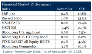 November’s market action was defined by turbulence. The S&P 500 fell over 3.0% during the first three weeks of the month on fears of an AI bubble. However, near the end of the month, fears receded on expectations for interest rate cuts. Therefore, the S&P 500 posted a modest gain of 0.2%. Small caps, represented by the Russell 2000, outperformed with a 1.0% advance, hinting at a tentative rotation away from mega-cap dominance.