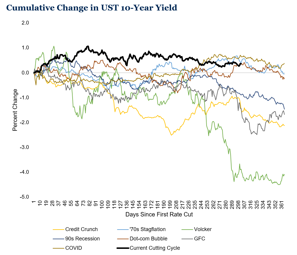 We have now had 150 basis points of rate cuts since the first cut in 2024. The bond market has exhibited a unique response to Fed action, with the long end of the curve persistently rising. In fact, the only significant historical period with similar market action was during 1970s stagflation. Today, the bond market is seemingly pricing in similar concerns about inflation. This raises the question: What happens when the Fed stops cutting rates? For investors, active management in fixed income may help navigate what could be a nonlinear rate environment.