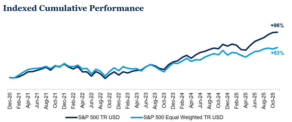 As the year winds down, markets remain supported by moderating inflation, stable monetary policy, and a favorable corporate fundamental backdrop. However, elevated valuations, concentration driven by the strength in AI-related securities, and persistent macro uncertainty call for thoughtful diversification and disciplined risk management. Our upcoming 2026 outlook will explore some of these themes in greater depth and provide guidance for positioning portfolios in an evolving market environment as we head into the new year.